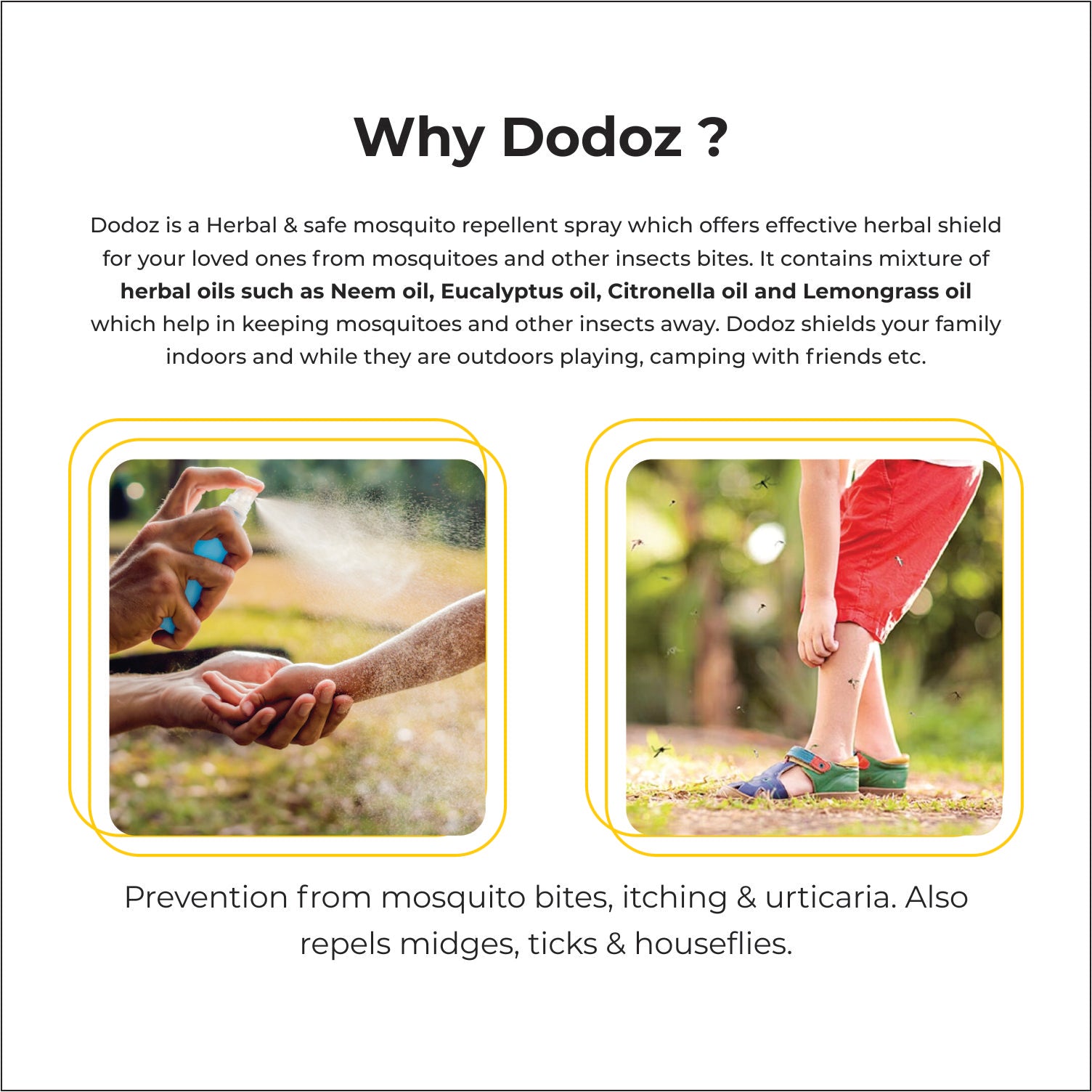Dodoz is a Herbal & safe mosquito repellent spray which offers effective herbal shield for your loved ones from mosquitoes and other insects bites. It contains mixture of herbal oils such as Neem oil, Eucalyptus oil, Citronella oil and Lemongrass oil which help in keeping mosquitoes and other insects away. Dodoz shields your family indoors and while they are outdoors playing, camping with friends etc.